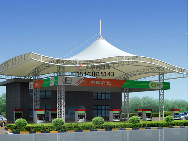 加油站罩棚膜結(jié)構(gòu)作為一種現(xiàn)代建筑結(jié)構(gòu),以高強度高柔韌性薄膜材料與張拉體系相結(jié)合,形成的具有一定剛度的空間結(jié)構(gòu)體,是集建筑學(xué)、結(jié)構(gòu)力學(xué)、精細化工與材料科學(xué)為一體的高科技工程。