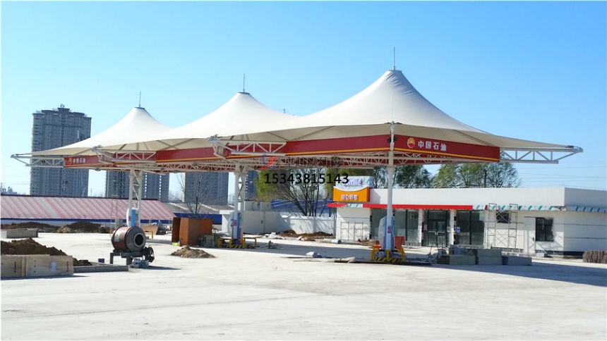 拉伸強度,也就是抵抗荷載作用的能力,必須要足夠高才可以。通常PVC涂覆聚酯長絲和PTFE涂覆玻璃纖維材料的拉伸強度都可以做到10噸力/米以上。模量越高,膜材就越容易被裁剪定型和進行預(yù)張拉。聚酯長絲的織物具有中等的模量,容易被使用,它的延伸率從結(jié)構(gòu)邊界點定位來說不是一個問題,除非大量的雪荷載作用其上。玻璃纖維的織物具有很高的模量,膜結(jié)構(gòu)收費站,如果膜材與結(jié)構(gòu)的尺寸不吻合,膜材的張拉(或安裝)曲率發(fā)生變化將是非常危險的事情。