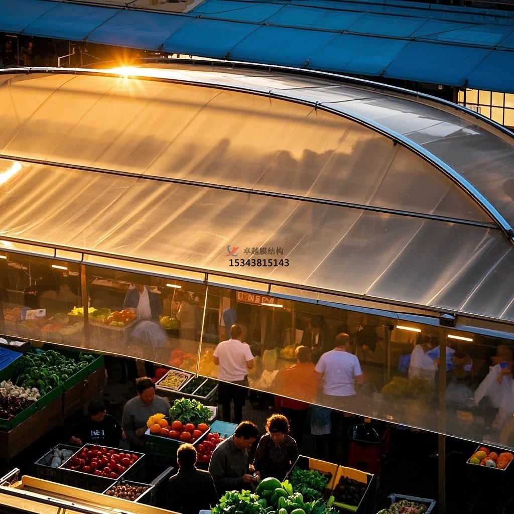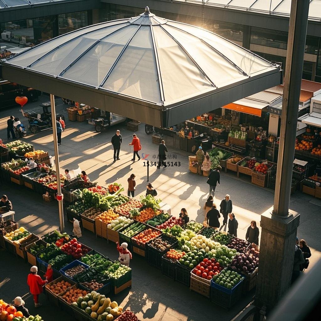傳統(tǒng)農(nóng)貿(mào)市場常常因建筑結(jié)構(gòu)的限制,存在空間布局不合理、攤位設(shè)置擁擠等問題。而膜結(jié)構(gòu)的無柱大空間特性,為農(nóng)貿(mào)市場的空間規(guī)劃提供了更大的靈活性。內(nèi)部可以根據(jù)商品種類、人流量等因素進(jìn)行自由劃分,設(shè)置寬敞的通道和開闊的交易區(qū)域,避免了顧客在購物過程中的擁擠和堵塞,提升了購物的便捷性與舒適度。此外,膜結(jié)構(gòu)還可以與其他建筑元素相結(jié)合,如在市場周邊設(shè)置膜結(jié)構(gòu)的雨棚或連廊,為顧客提供遮風(fēng)擋雨的過渡空間,進(jìn)一步優(yōu)化了市場的整體空間利用效率。?