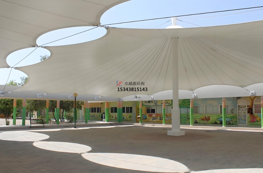膜材料具有良好的透光性,可以在保證遮陽的同時,讓自然光線柔和地灑入室內(nèi),為孩子們提供充足的日照,有利于他們的視力保護和身心健康。同時,膜結(jié)構(gòu)的設(shè)計通常結(jié)合高效的通風(fēng)系統(tǒng),確保室內(nèi)空氣流通,即使在炎熱的夏季也能保持室內(nèi)涼爽,為孩子們創(chuàng)造一個舒適的學(xué)習(xí)環(huán)境。