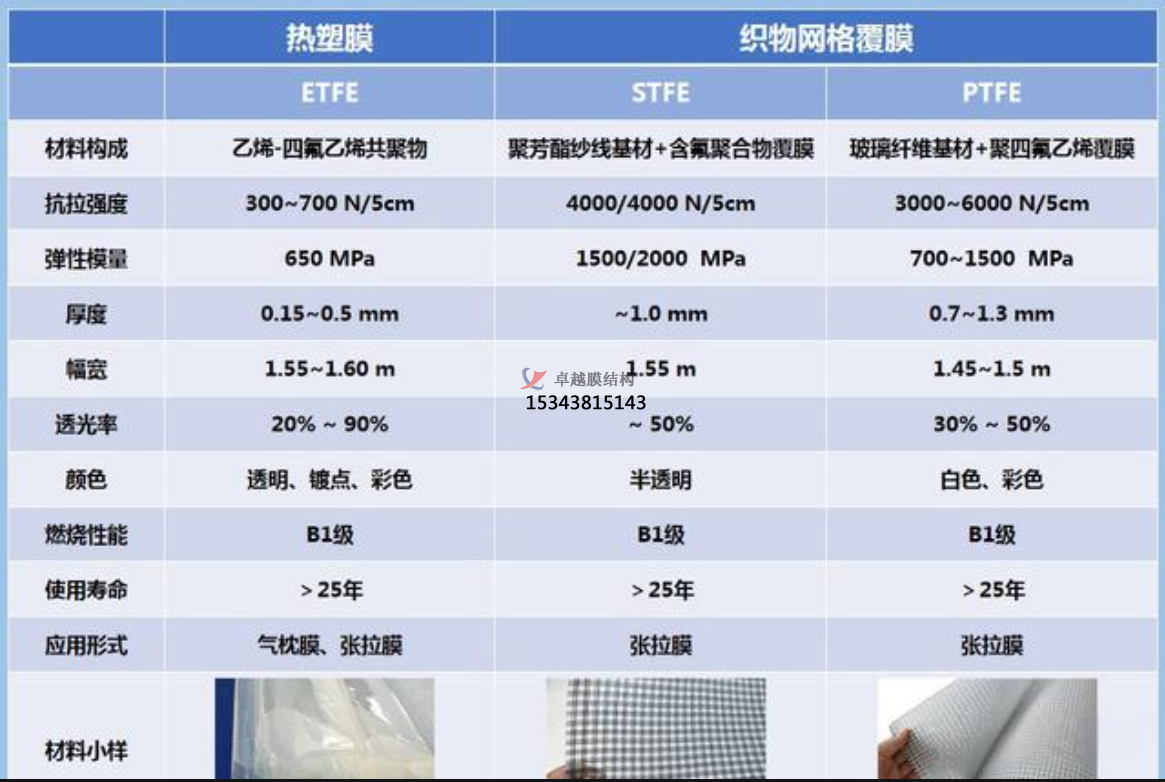 在建筑和結構的方案設計階段,選擇高透光率的膜材時,常常會對不同種類膜材的特點把握不準。將ETFE、STFE、PTFE高透膜的各自特點進行對比,為高透膜的選擇提供有理有據(jù)的技術支撐。