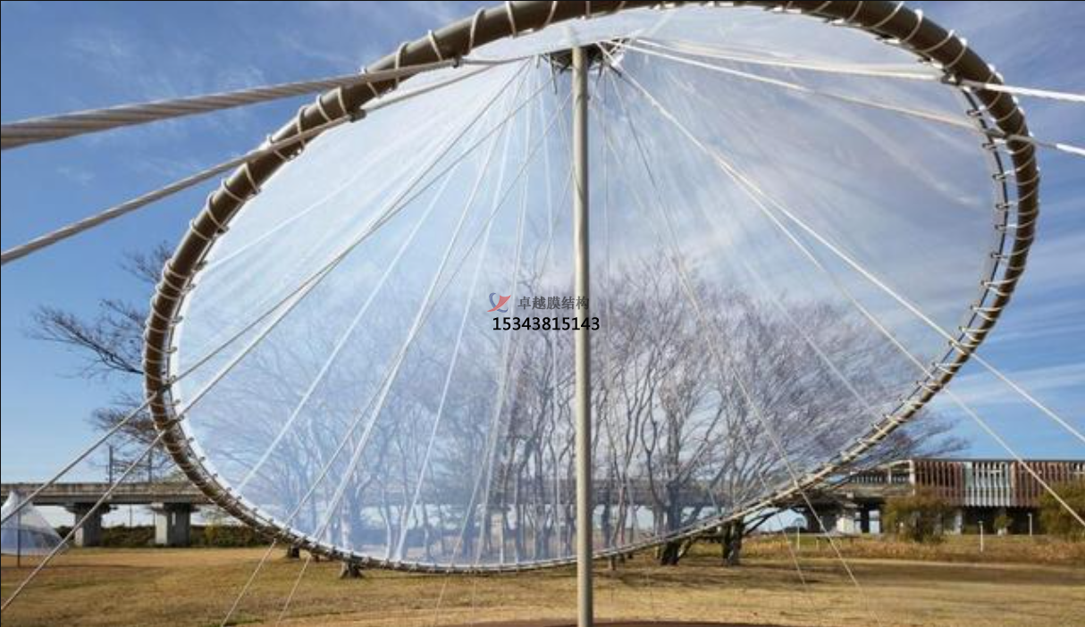 STFE不是化學成分的英文縮寫,而是膜材商品名的英文縮寫(Structural、Transparent、Fluorinated、Envelope),其本質是網(wǎng)格覆膜。區(qū)別在于其織物基材,不同于PVC膜材的聚酯纖維紗線,也不同于PTFE膜材的玻璃纖維紗線,而是擠壓特殊涂層的聚芳酯紗線;覆膜為特種含氟聚合物(涉及商業(yè)秘密未公開),單面覆膜。覆膜的清晰度較好,可實現(xiàn)一定程度的透景。同時,由于有織物基材提高了膜材強度,抗拉強度可達4000N/5cm。即使不加拉索,膜單元跨度一般在3m以上。