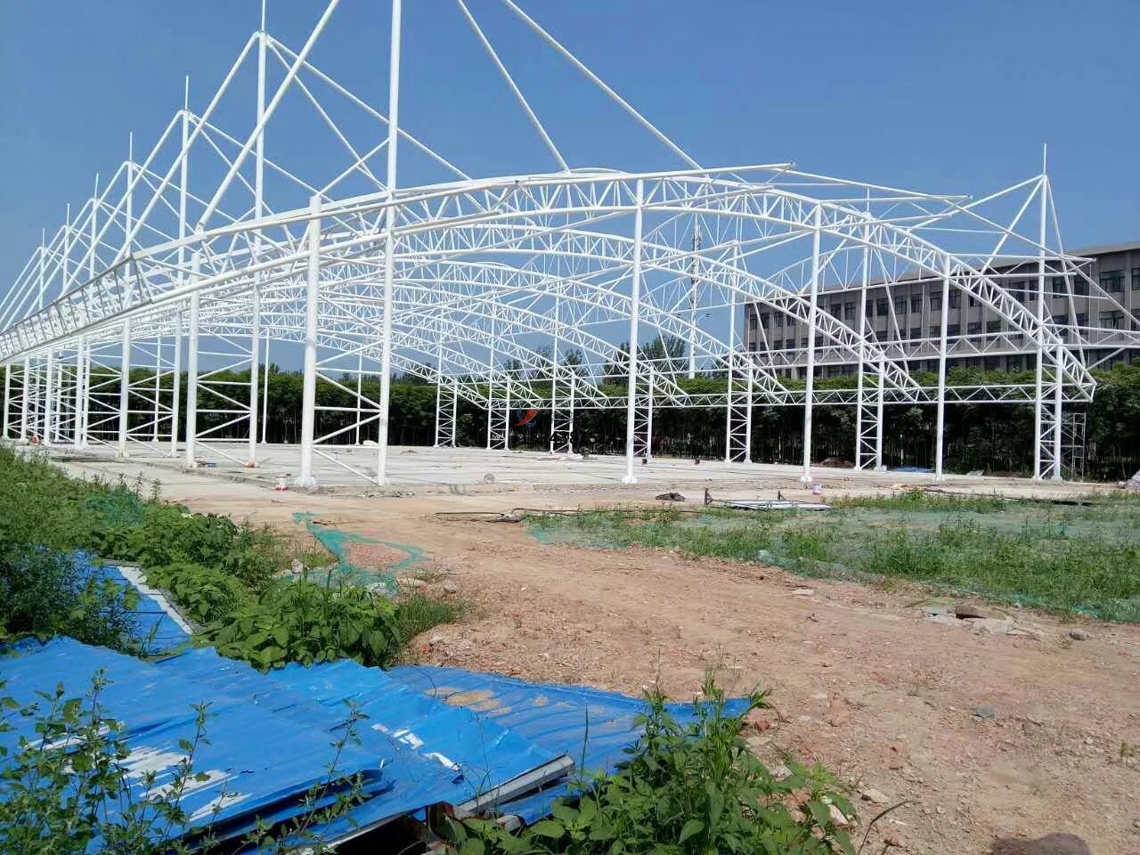 籃球場(chǎng)膜結(jié)構(gòu)工程施工流程與關(guān)鍵技術(shù):其流程包含支撐結(jié)構(gòu)安裝(以鋼結(jié)構(gòu)為例)、膜材加工與安裝、 膜面張拉與調(diào)整、節(jié)點(diǎn)處理與防水密封。在關(guān)鍵技術(shù)點(diǎn)中,支撐結(jié)構(gòu)的安裝涵蓋構(gòu)件吊裝,按施工順序吊裝鋼柱、鋼梁,使用經(jīng)緯儀和水準(zhǔn)儀控制垂直度和標(biāo)高,臨時(shí)固定后進(jìn)行焊接或螺栓連接。焊工需持證上崗,焊接前清理焊口,采用多層多道焊,焊后進(jìn)行焊縫探傷檢測(cè)(如超聲波檢測(cè)),確保焊接質(zhì)量。焊接部位及損傷的防腐層需重新涂刷防銹漆和面漆,涂層厚度符合設(shè)計(jì)要求。膜材加工與安裝,膜材的加工需要根據(jù)深化設(shè)計(jì)圖紙,在工廠內(nèi)對(duì)膜材進(jìn)行裁剪、熱合(或縫合),形成完整的膜單元。加工完成后進(jìn)行預(yù)拼裝(預(yù)張力測(cè)試),檢查膜面尺寸、形狀是否符合設(shè)計(jì)要求,記錄膜材的張拉方向和定位標(biāo)記。然后進(jìn)行膜材吊裝,采用多點(diǎn)吊裝法,使用專(zhuān)用吊具(如尼龍吊帶)避免膜材損傷,吊裝過(guò)程中需專(zhuān)人指揮,確保膜面平穩(wěn)展開(kāi)。先將膜材邊緣與支撐結(jié)構(gòu)上的夾具臨時(shí)固定,再逐步張拉至設(shè)計(jì)位置。在膜面張拉與調(diào)整中,首先注意張拉順序,遵循 “由中間向四周” 或 “對(duì)稱(chēng)張拉” 原則,分階段逐步施加預(yù)張力,避免膜面局部應(yīng)力集中。然后是張力控制,使用張力計(jì)實(shí)時(shí)監(jiān)測(cè)膜面張力值,達(dá)到設(shè)計(jì)張力值的80%后暫停張拉,靜置24小時(shí)讓膜材應(yīng)力松弛,再進(jìn)行二次張拉至設(shè)計(jì)值。最后是形態(tài)調(diào)整,張拉過(guò)程中觀察膜面是否平整,有無(wú)褶皺或積水隱患,通過(guò)調(diào)整支撐結(jié)構(gòu)的位移或夾具位置優(yōu)化膜面形態(tài)。在節(jié)點(diǎn)處理與防水密封中,膜材與鋼結(jié)構(gòu)連接采用夾具固定(如鋁合金夾具),螺栓間距控制在200-300mm,確保連接牢固。膜材之間的拼接縫采用熱合焊接,焊縫寬度不小于50mm,焊接后進(jìn)行氣密性檢測(cè)。最后進(jìn)行防水處理,在膜結(jié)構(gòu)邊緣與建筑主體連接處設(shè)置防水卷材或密封膠,防止雨水滲漏。排水坡度需≥5%,確保膜面雨水能迅速排至天溝或地漏。