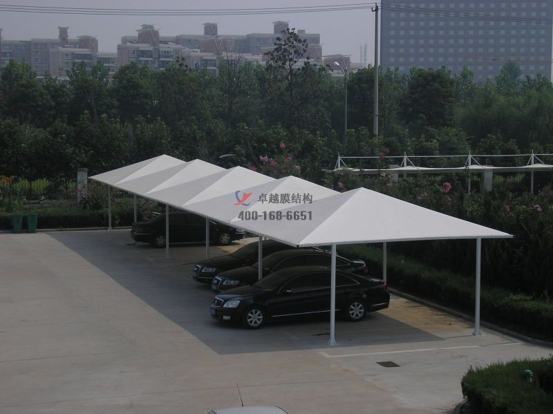 膜結(jié)構(gòu)汽車棚是一種空間結(jié)構(gòu)是由各種高強(qiáng)度薄膜材料和加強(qiáng)成員(鋼框架、鋼柱或鋼電纜)產(chǎn)生一定的預(yù)緊應(yīng)力在其內(nèi)部以某種方式形成一定的空間形狀。