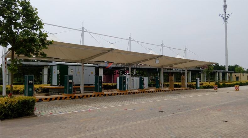 商業(yè)廣場(chǎng)雨棚搭建的篷布采用PVC/PVDF/PTFE/ETFE,而膜材的更大特點(diǎn)是強(qiáng)度高、耐久性好、防火難燃、自潔性好,不受紫外線影響,使用壽命長(zhǎng),一般15-30年。具有高透光率,透光率為13%,對(duì)熱能反射率73%,熱吸收量很少。正是因?yàn)檫@種劃時(shí)代的膜材料的發(fā)明,使商業(yè)廣場(chǎng)雨棚搭建成為現(xiàn)代化的永久建筑。