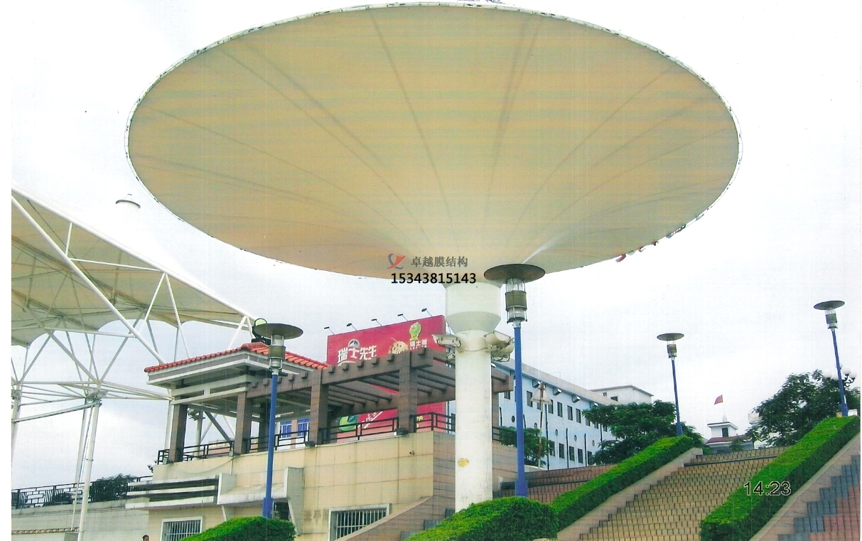 膜結(jié)構(gòu)遮陽雨棚打破傳統(tǒng)純直線建筑風格的模式,以其獨有的優(yōu)美曲面造型,簡潔、明快、剛與柔、力與美的完美組合,給建筑師提供有更大的創(chuàng)造空間。