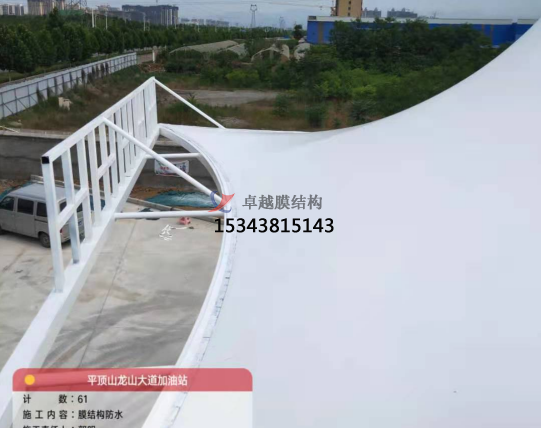 該項(xiàng)目位于平頂山汝州市龍山大道,由中石油直營,采用骨架式弧形軟邊張拉膜,設(shè)計(jì)壽命15年,膜材采用PVDF5000N 建筑膜材,完工時(shí)間2021年6月10日