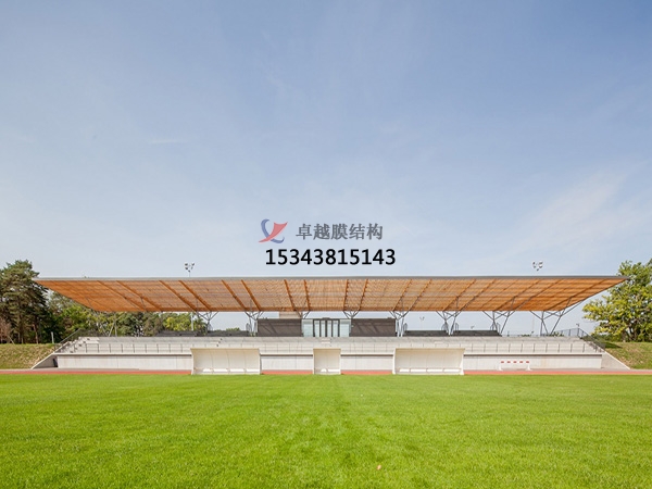 由于膜材的光透性,白天陽光可以透過膜材形成慢射光,使室內達到和室外幾乎一樣的自然效果,因此膜結構能創(chuàng)造出與自然環(huán)境相媲美的空間形式。體育場看臺采用膜結構的設計,膜結構的張拉樣式無形當中增大了空間跨度,輕輕松松的將整個的看臺處被覆蓋,在簡化了建筑結構的同時建筑重量也輕松很多,讓施工更簡便,還降低了施工工人的危險系數(shù),縮短了工程的建造工期。
