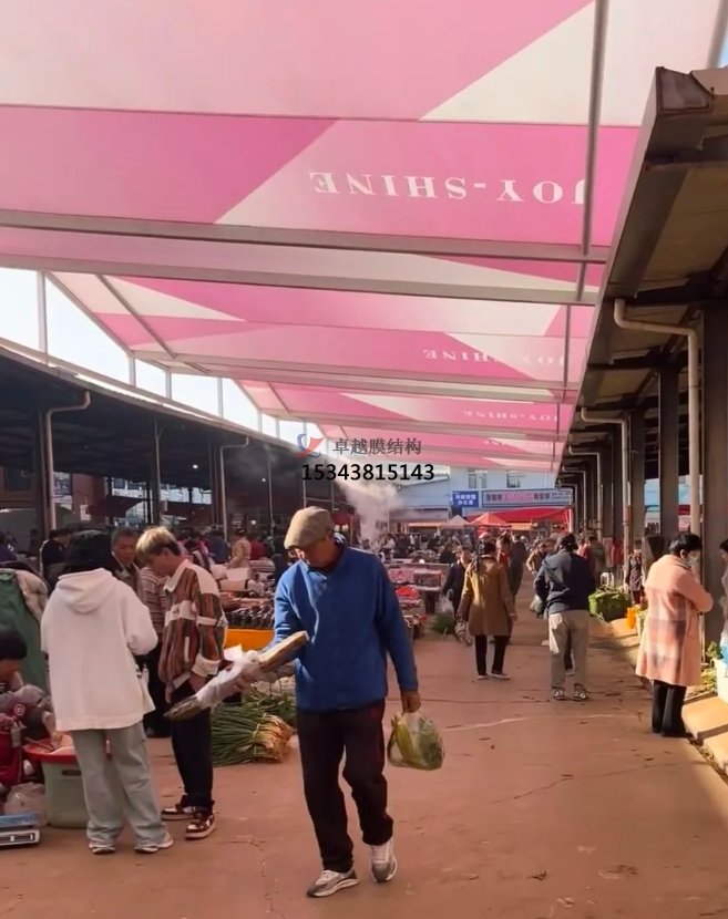 美觀與個(gè)性化彰顯:膜結(jié)構(gòu)設(shè)計(jì)極具創(chuàng)意,能依據(jù)農(nóng)貿(mào)市場(chǎng)所在區(qū)域的文化特色、建筑風(fēng)格,定制獨(dú)特造型與色彩。或如靈動(dòng)的波浪,或似展翅的飛鳥,為傳統(tǒng)農(nóng)貿(mào)市場(chǎng)注入現(xiàn)代時(shí)尚元素,提升市場(chǎng)整體形象與辨識(shí)度。鮮明的色彩搭配,不僅能吸引消費(fèi)者目光,還能為市場(chǎng)營(yíng)造活潑、熱鬧的氛圍,讓農(nóng)貿(mào)市場(chǎng)成為城市中一道獨(dú)特的人文景觀,成為居民休閑購(gòu)物的好去處,帶動(dòng)周邊商業(yè)活力。