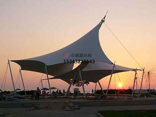 膜結(jié)構(gòu)景觀,是以建筑織物,即膜材料為張拉主體,與支撐構(gòu)件或拉索共同組成的結(jié)構(gòu)體系,它以其新穎獨(dú)特的建筑造型,良好的受力特點(diǎn)——成為大跨度空間結(jié)構(gòu)的主要形式之一。膜材料是指聚酯纖維基布或PVDF、PVF、PTFE等不同的表面涂層,配以優(yōu)質(zhì)的PVC組成的具有穩(wěn)定的形態(tài),并可承受一定載荷的建筑紡織品。它的壽命因不同的表面涂層而異,一般可達(dá)成10-20年。