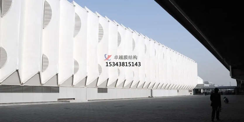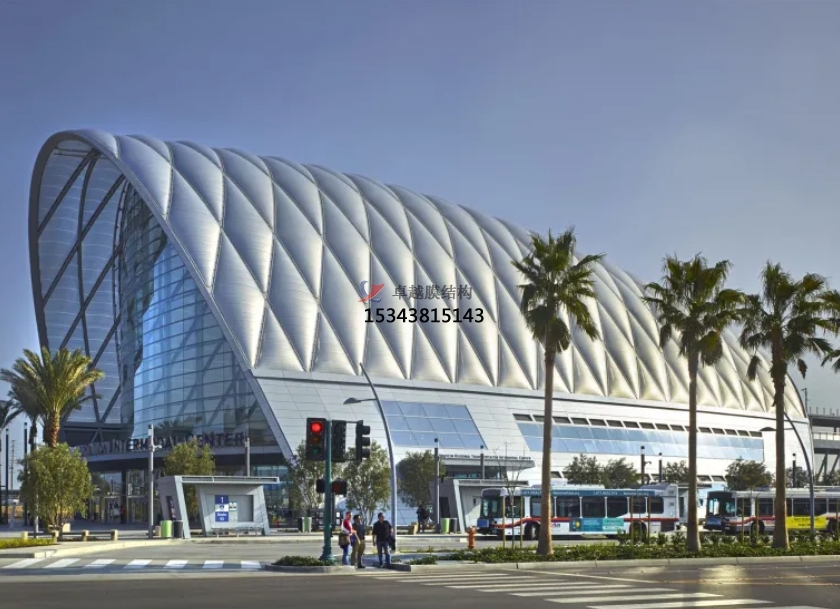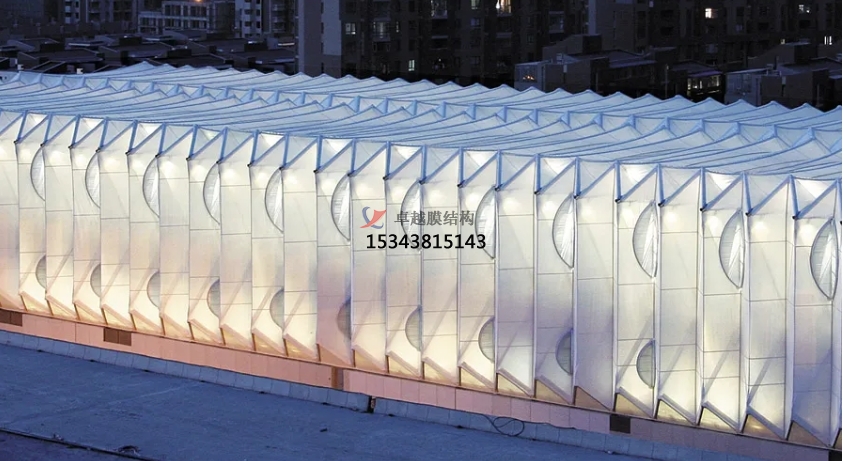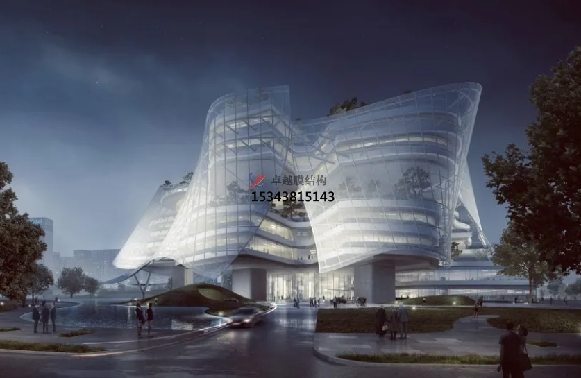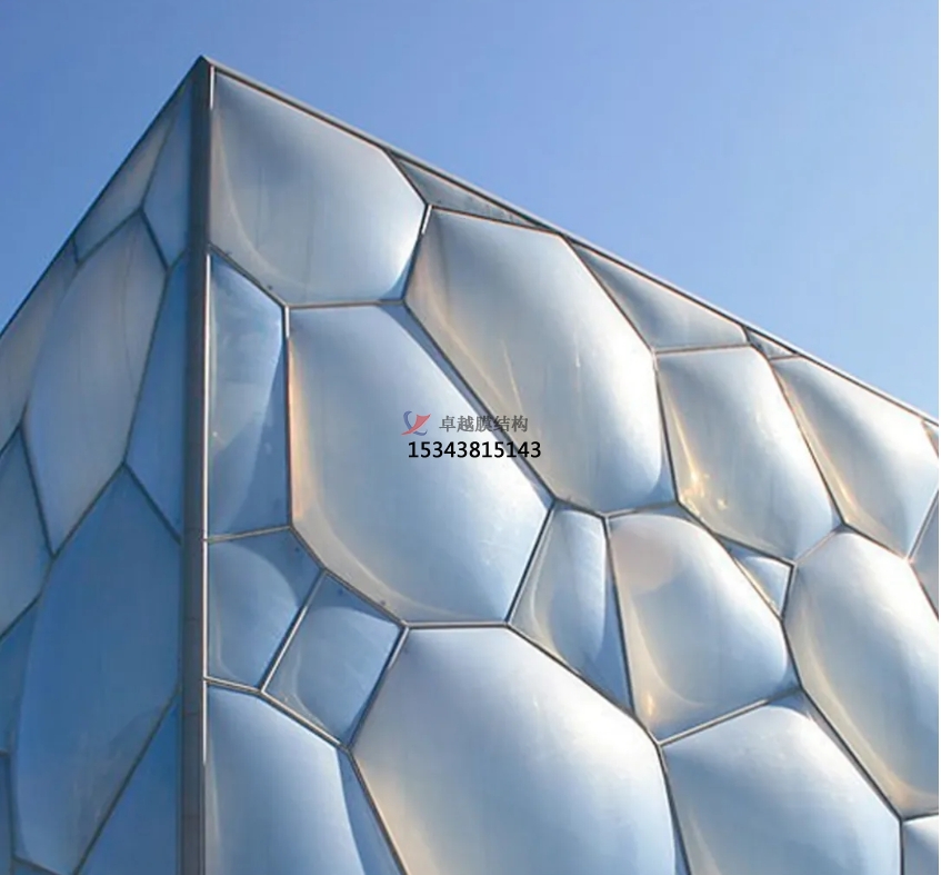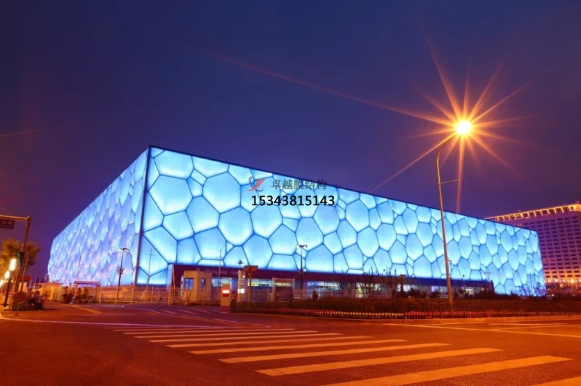 膜結(jié)構(gòu)使得建筑輕盈感十足,膜材料的良好透性使得建筑界面透光而不透視。由于該材料(ETFE)氣枕在陽光底下富有通透感光線可以通過漫射和折射進入界面,讓膜結(jié)構(gòu)建筑呈現(xiàn)出朦朧夢幻之美。