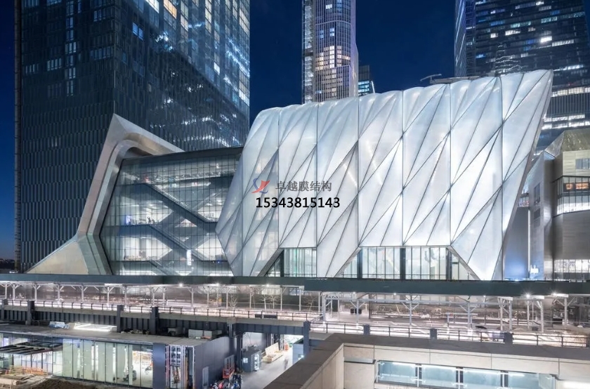 The Shed藝術(shù)中心樓高37米,有一個可伸縮的建筑表皮,伸縮式外殼由暴露的鋼斜架構(gòu)成,并包裹在半透明墊層中。其墊層由耐用輕質(zhì)且隔熱性能極佳的四氟乙烯(ETFE)聚合物構(gòu)成。