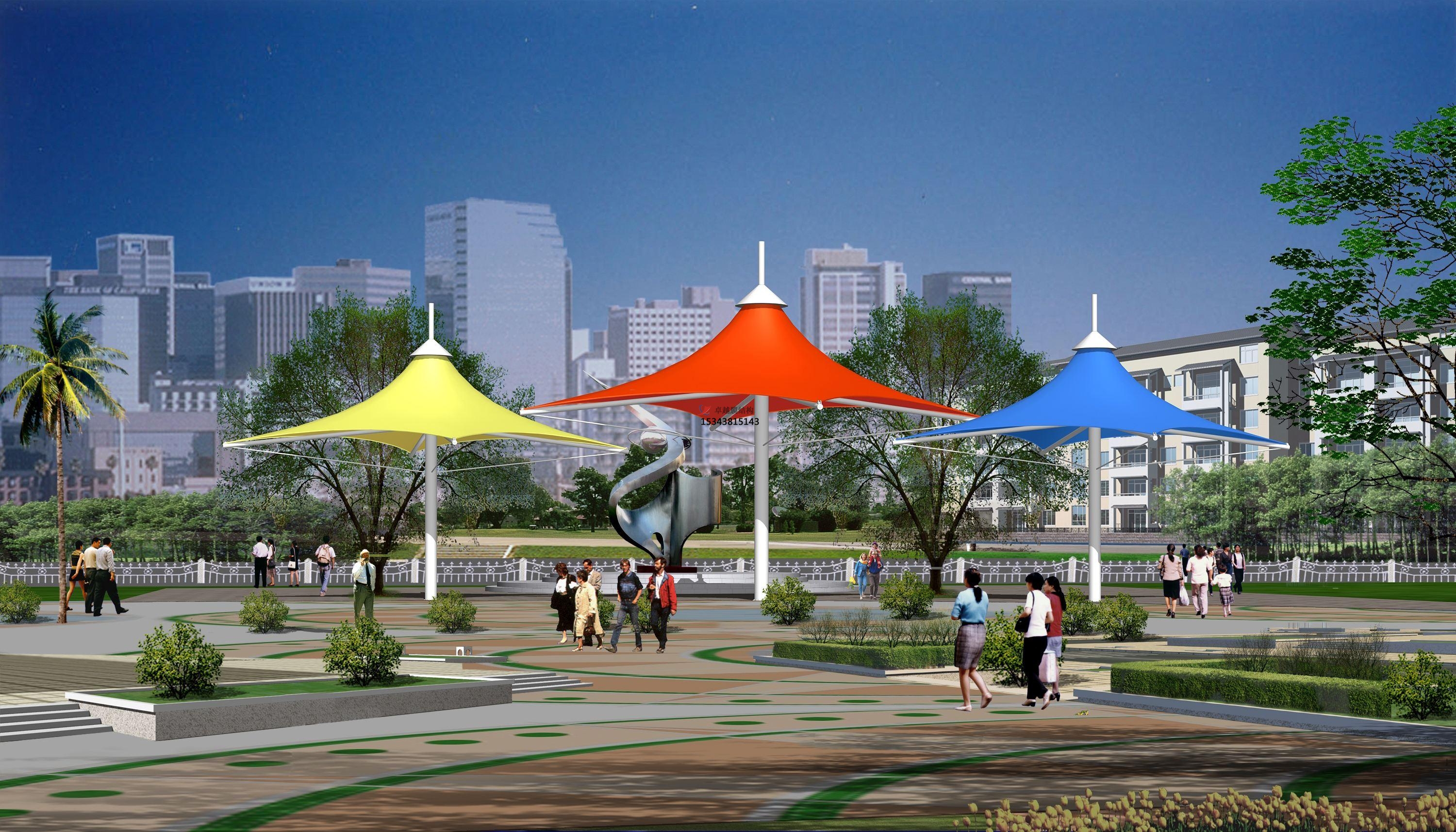 5、景觀膜結構遮陽棚材料的可加工性能、幅寬及景觀膜結構遮陽棚建筑效果圖的膜面形狀等。
