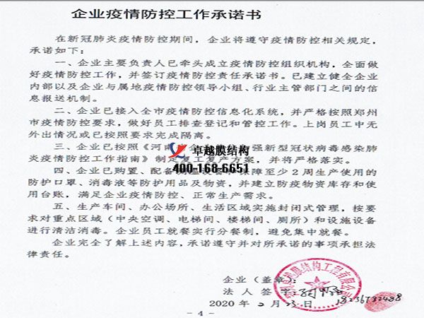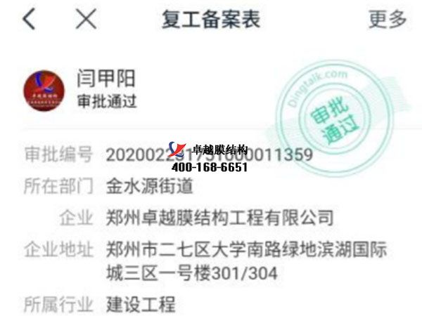 今天你復(fù)工了嗎?我們卓越膜結(jié)構(gòu)工程有限公司經(jīng)過層層審批,更終批準(zhǔn)于2020年3月2號(hào)正式復(fù)工。