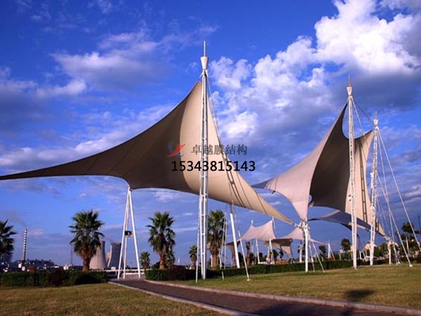 膜結(jié)構(gòu)具有較好的隔熱效果,對太陽熱能可反射掉70%,膜材本身吸收了17%,傳熱13%,而透光率卻在20%以上,經(jīng)過10年的太陽光直接照射,其輝度仍能保留70%。這與它本身的材質(zhì)有關(guān)系。膜結(jié)構(gòu)跨度空間大指出其因為自重輕,膜結(jié)構(gòu)修建能夠不需要內(nèi)部支撐面大跨度掩蓋空間,這使大家能夠列靈活計和運用修建空間,描繪出愈加有構(gòu)思的修建。所以一般膜結(jié)構(gòu)建筑總能有著讓人賞心悅目的外觀設(shè)計,加上自身的實用經(jīng)濟(jì)性讓膜結(jié)構(gòu)得到了更多建筑的青睞之選。