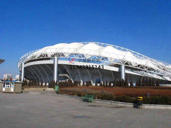 膜結(jié)構(gòu)的結(jié)構(gòu)形式:是由多種高強(qiáng)薄膜材料PVC或Teflon及加強(qiáng)構(gòu)件鋼架、鋼柱或鋼索通過(guò)一定方式使其內(nèi)部產(chǎn)生一定的預(yù)張應(yīng)力以形成某種空間形狀,作為覆蓋結(jié)構(gòu),并能承受一定的外荷載作用的一種空間結(jié)構(gòu)形式。