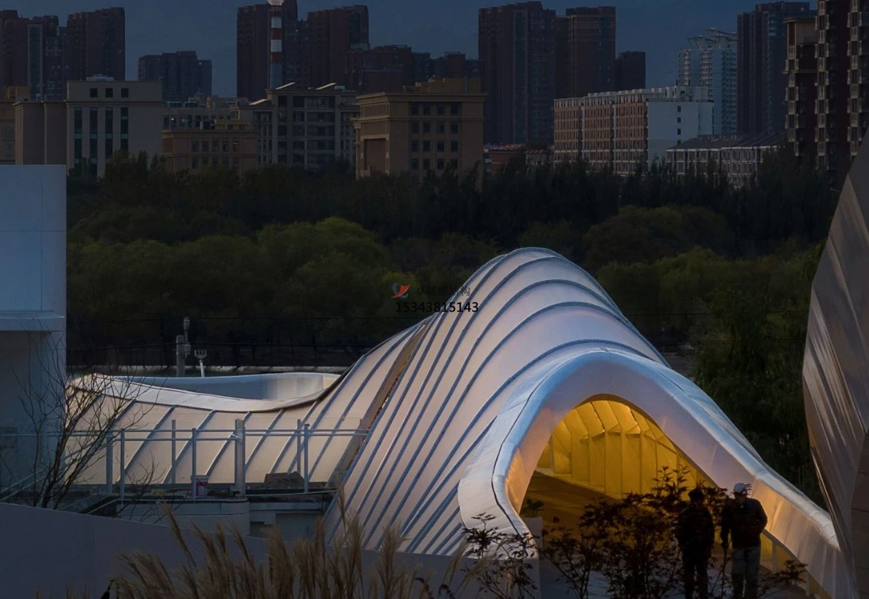 該半透明法拉利進(jìn)口PTFE膜材,遮陽防水,自然采光,既可以保證日間二層屋頂花園能夠有充分光照,夜間也可利用膜的反射來提供屋頂花園的照明功能需求。