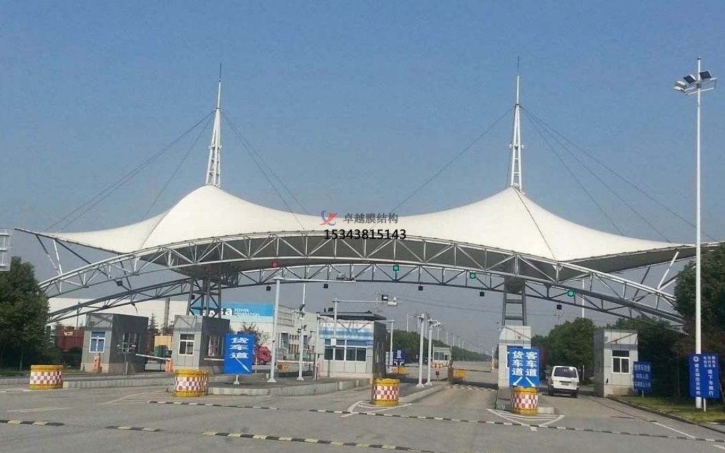 收費(fèi)站除了收費(fèi)亭,最吸引人眼球的就是其頂棚,隨著膜結(jié)構(gòu)工程技術(shù)的不斷發(fā)展,現(xiàn)在越來越多的收費(fèi)站頂棚開始采用膜結(jié)構(gòu),與傳統(tǒng)的混凝土陽光板頂棚相比,收費(fèi)站膜結(jié)構(gòu)頂棚具有非常多的優(yōu)勢。