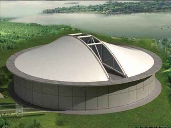 污水池加蓋膜結構材質(zhì)說(shuō)明:一般可分為張拉式膜結構及骨架支承式膜結構二種,它們具有不同的結構特點(diǎn)、建筑表現形式,適應不同的應用場(chǎng)所。鋼支承反吊膜結構是專(zhuān)門(mén)針對污水池加蓋開(kāi)發(fā)的新型結構方式,選用了耐腐蝕的膜材料作為覆蓋材,并通過(guò)反吊的形式來(lái)適應污水池的腐蝕性環(huán)境。