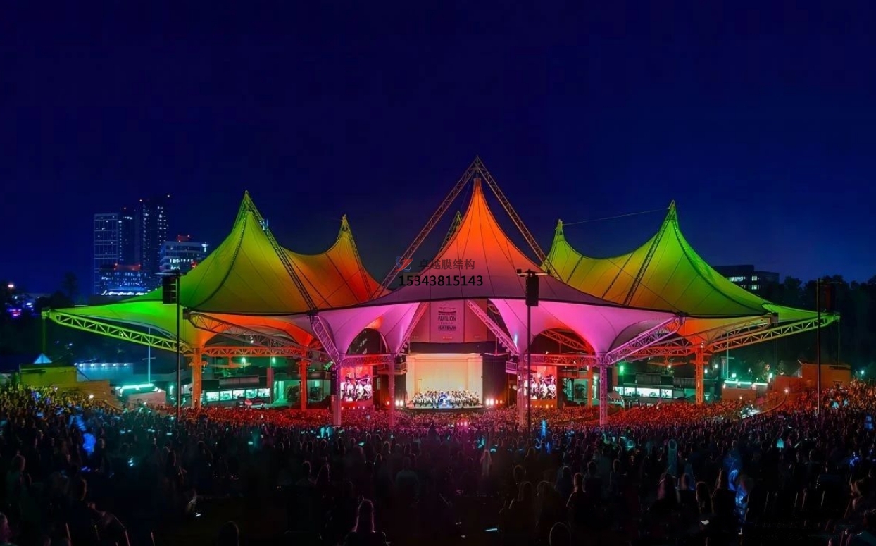 膜結(jié)構(gòu)景觀的膜材料可以透光或反射光線,創(chuàng)造出豐富的光影效果,使得建筑物在不同的時(shí)間和角度呈現(xiàn)出不同的視覺效果。膜結(jié)構(gòu)景觀常用的膜材料是PTFE膜材料和PVC膜材料。膜結(jié)構(gòu)景觀棚具有優(yōu)異的抗拉強(qiáng)度和耐候性能,能夠承受風(fēng)力和其他天氣因素的沖擊。