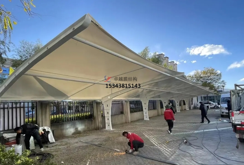 膜結(jié)構(gòu)材料具有良好的可塑性,能夠呈現(xiàn)出流暢的曲線和獨(dú)特的造型。對(duì)于7字型車(chē)棚而言,膜材可以根據(jù)設(shè)計(jì)要求形成優(yōu)美的坡面和線條,與周邊的建筑和環(huán)境相融合。它可以是簡(jiǎn)潔現(xiàn)代的風(fēng)格,展現(xiàn)出科技感和時(shí)尚感;也可以是富有藝術(shù)氣息的設(shè)計(jì),成為整個(gè)區(qū)域的視覺(jué)焦點(diǎn),為原本單調(diào)的停車(chē)區(qū)域增添一份美感。