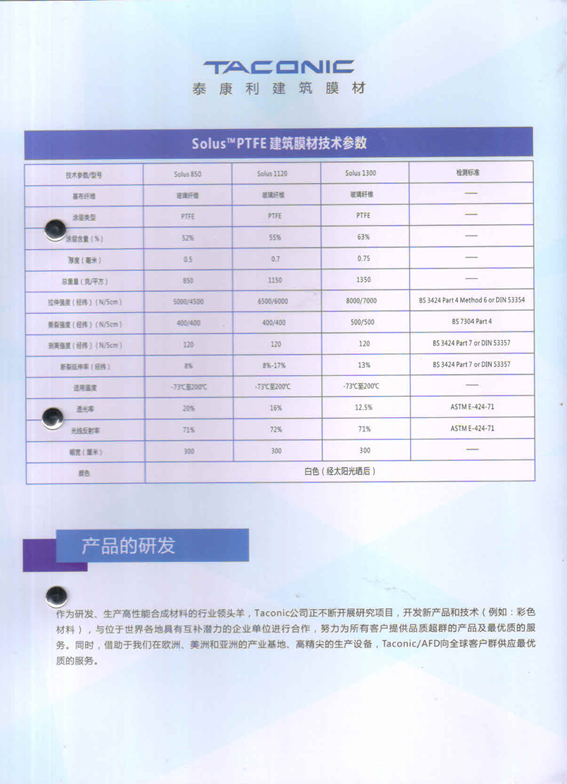 十多年來(lái),Taconic公司持續(xù)地?cái)U(kuò) 大了其建材織布的生產(chǎn)能力。今天,Taconic的建 材織布分支部門(mén)](AFD)已成為全球建筑用級(jí)別PTFE /織布的主要生產(chǎn)廠家,Taconic向全世界織布結(jié)構(gòu)公司供應(yīng)Solus 品牌的建材織布。借助于我們?cè)跉W洲,美洲和亞洲的產(chǎn)業(yè)基地,Taconic/AFD 通過(guò)其分布各地的加工,銷(xiāo)售和服務(wù)網(wǎng)絡(luò)向全球客戶群供應(yīng)優(yōu)質(zhì)服務(wù)。